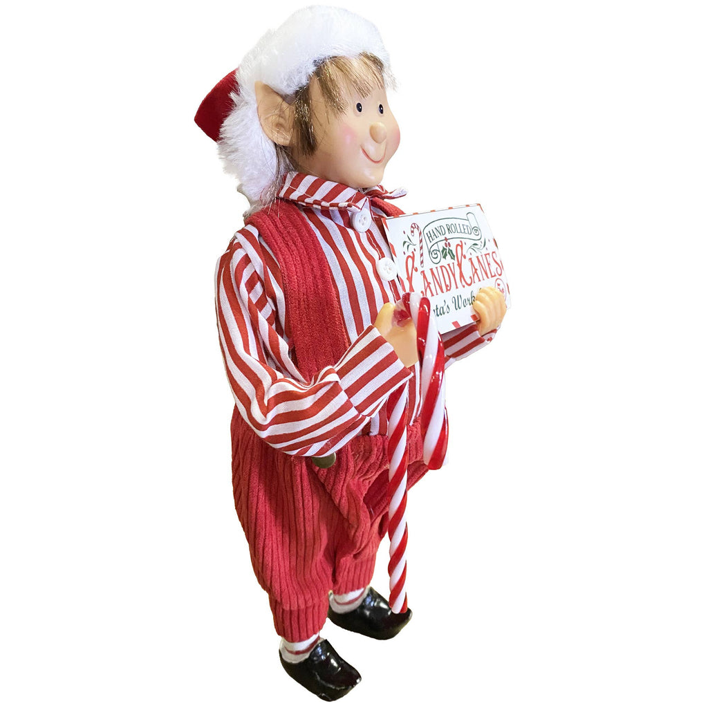 Whether you're using them to decorate the Christmas tree, or secretly stealing them off the tree for a sweet treat, candy canes bring a lot of joy and fun to the holiday season! This happy elf, dressed in bright candy cane stripes, is carrying one of his favorite red and white candies in one arm and a Candy Cane advertisement in the other. Enjoy the holidays in style with this elegantly handcrafted 12" Candy Cane Elf that is sure to provide many seasons of pleasure.