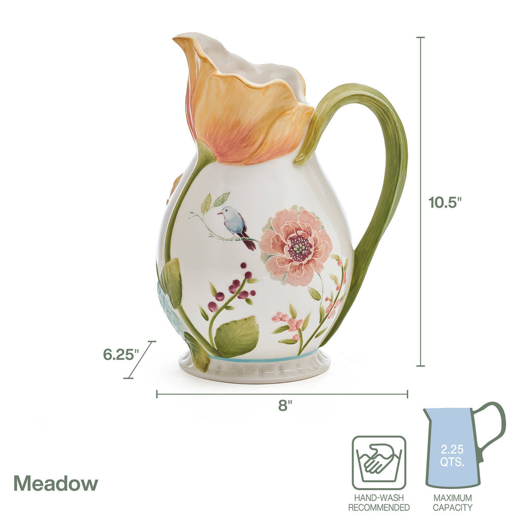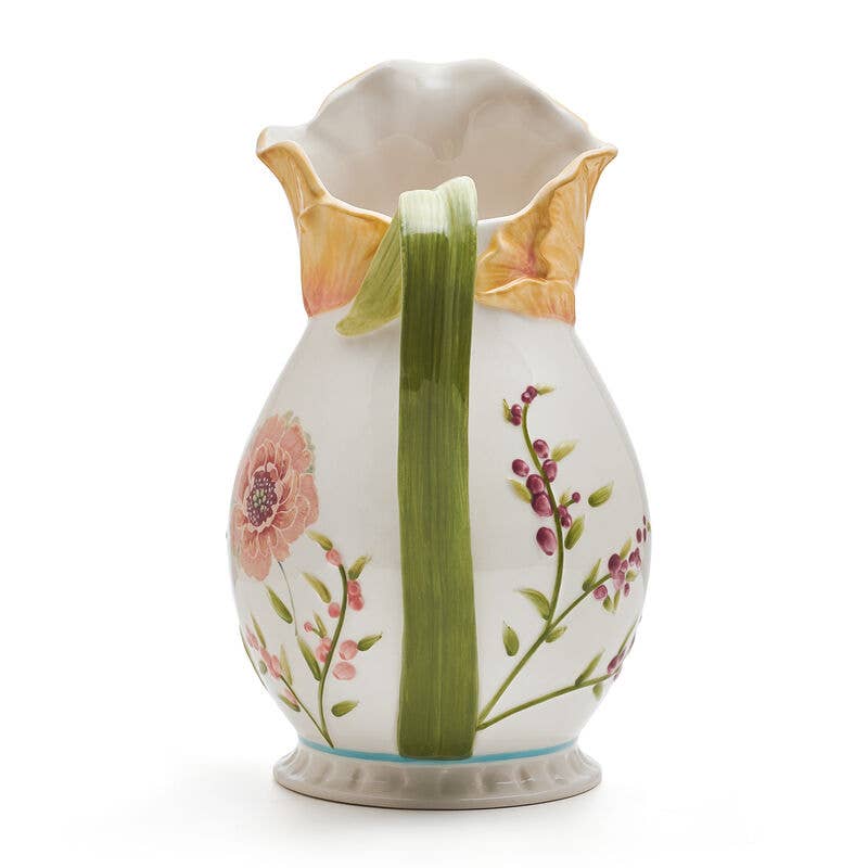 Serve water, iced tea, juice, sangria, margaritas, and more in this Meadow Pitcher by Fitz and Floyd. This eye-catching, flower-shaped pitcher features a stem handle and intricate floral accents that bring the liveliness of spring to your kitchen. Beautifully crafted from durable earthenware and hand-painted for a unique, detailed look. Hand-wash. Measures 8-inches long by 6-1/4 inches diameter by 10-1/2 inches high and holds 2-1/2 quarts.