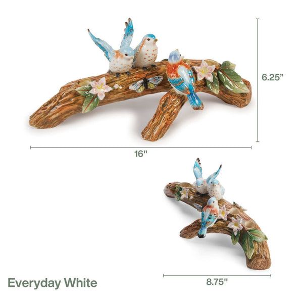 CHARMING CANDLE HOLDER features three blue and orange song birds perching a tree branch with paster flowers giving a feeling of spring