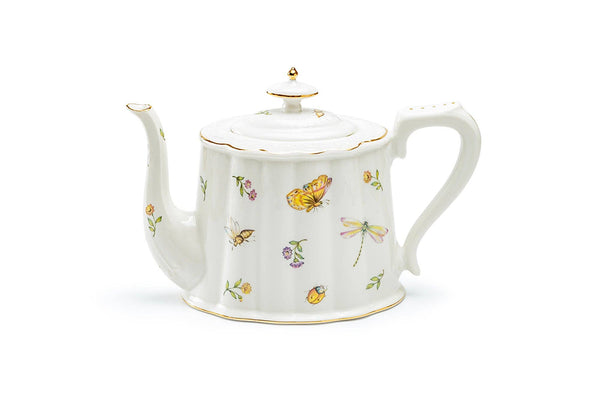 This teapot features a variety of Summer Garden themed decals, including petite flowers, green dragonflies, yellow dragonflies, yellow butterflies, blue butterflies, bees, and beetles. As a result, each teapot has a unique combination of decal patterns, making it possible that the appearance of the teapot may not match the listing images precisely.
